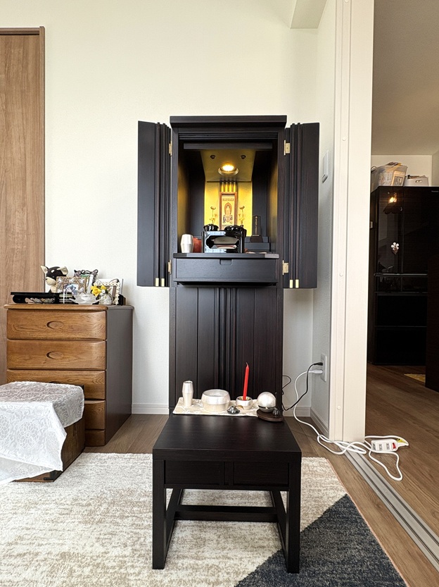 北九州市小倉南区のお客様で宗旨は日蓮宗です。以前、娘様ご夫婦が当店にてご購入頂いた経緯でご縁を頂きました。お仏壇はウォールナット材を使用したモダン仏壇です。